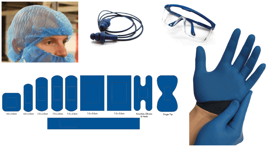 Cofia, tapones auditivos, cubre-barbas, guantes de látex. Y curitas de gran variedad de tamaños.